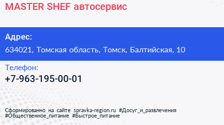 MASTER SHEF, автосервис по адресу 634021, Томская область, Томск, Балтийская, 10 в дальнейшем Организация, размещена в следующих категориях: