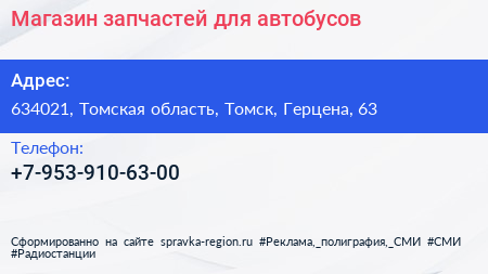 Магазин запчастей для автобусов по адресу 634021, Томская область, Томск, Герцена, 63 в дальнейшем Организация, размещена в следующих категориях: