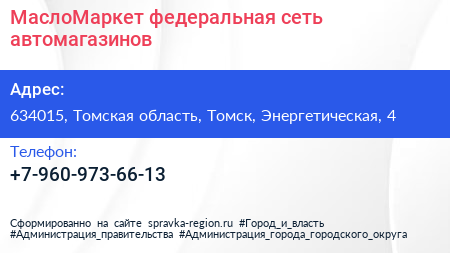 МаслоМаркет, федеральная сеть автомагазинов по адресу 634015, Томская область, Томск, Энергетическая, 4 в дальнейшем Организация, размещена в следующих категориях: