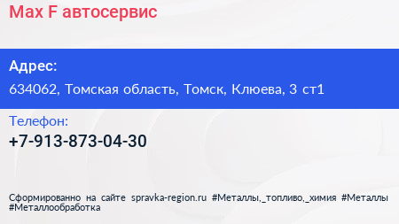 Max-F, автосервис по адресу 634062, Томская область, Томск, Клюева, 3 ст1 в дальнейшем Организация, размещена в следующих категориях: