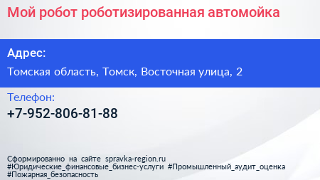 Мой робот, роботизированная автомойка по адресу Томская область, Томск, Восточная улица, 2 в дальнейшем Организация, размещена в следующих категориях: