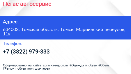 Пегас, автосервис по адресу 634003, Томская область, Томск, Мариинский переулок, 11а в дальнейшем Организация, размещена в следующих категориях: