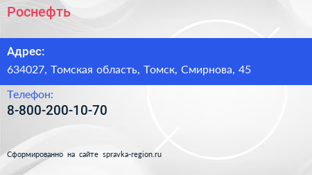 Роснефть по адресу 634027, Томская область, Томск, Смирнова, 45 в дальнейшем Организация, размещена в следующих категориях: