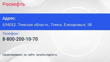 Роснефть по адресу 634012, Томская область, Томск, Елизаровых, 58 в дальнейшем Организация, размещена в следующих категориях: