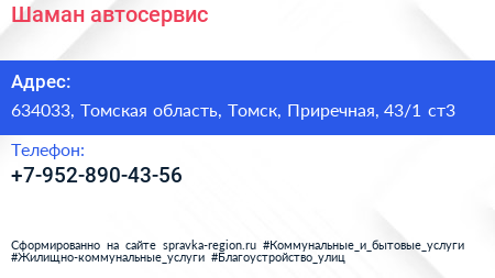 Шаман, автосервис по адресу 634033, Томская область, Томск, Приречная, 43/1 ст3 в дальнейшем Организация, размещена в следующих категориях: