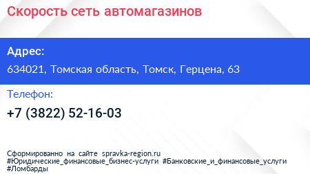 Скорость, сеть автомагазинов по адресу 634021, Томская область, Томск, Герцена, 63 в дальнейшем Организация, размещена в следующих категориях: