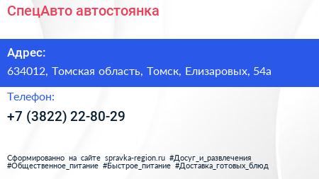 СпецАвто, автостоянка по адресу 634012, Томская область, Томск, Елизаровых, 54а в дальнейшем Организация, размещена в следующих категориях: