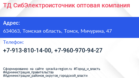 ТД СибЭлектроисточник, оптовая компания по адресу 634063, Томская область, Томск, Мичурина, 47 в дальнейшем Организация, размещена в следующих категориях: