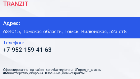 TRANZIT по адресу 634015, Томская область, Томск, Вилюйская, 52а ст8 в дальнейшем Организация, размещена в следующих категориях: