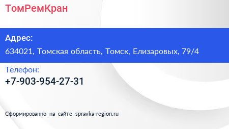 ТомРемКран по адресу 634021, Томская область, Томск, Елизаровых, 79/4 в дальнейшем Организация, размещена в следующих категориях: