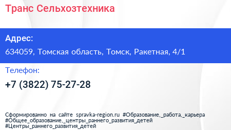Транс-Сельхозтехника по адресу 634059, Томская область, Томск, Ракетная, 4/1 в дальнейшем Организация, размещена в следующих категориях: