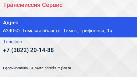 Трансмиссия Сервис по адресу 634050, Томская область, Томск, Трифонова, 1а в дальнейшем Организация, размещена в следующих категориях: