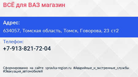 ВСЁ для ВАЗ, магазин по адресу 634057, Томская область, Томск, Говорова, 23 ст2 в дальнейшем Организация, размещена в следующих категориях: