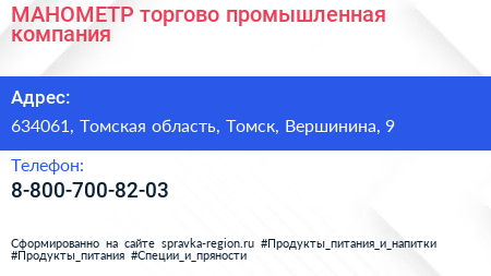 МАНОМЕТР, торгово-промышленная компания по адресу 634061, Томская область, Томск, Вершинина, 9 в дальнейшем Организация, размещена в следующих категориях: