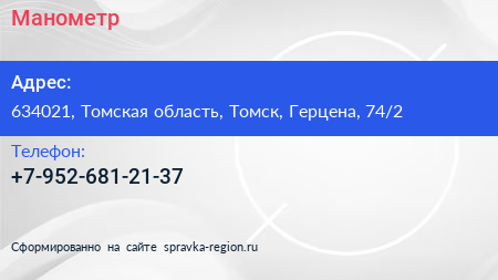 Манометр по адресу 634021, Томская область, Томск, Герцена, 74/2 в дальнейшем Организация, размещена в следующих категориях: