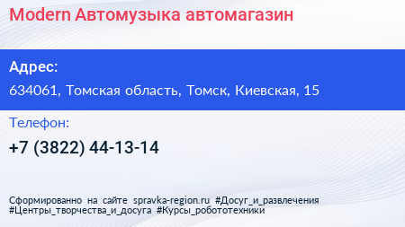 Modern Автомузыка, автомагазин по адресу 634061, Томская область, Томск, Киевская, 15 в дальнейшем Организация, размещена в следующих категориях: