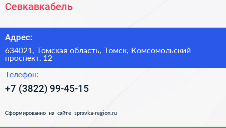 Севкавкабель по адресу 634021, Томская область, Томск, Комсомольский проспект, 12 в дальнейшем Организация, размещена в следующих категориях: