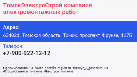 ТомскЭлектроСтрой, компания электромонтажных работ по адресу 634021, Томская область, Томск, проспект Фрунзе, 117Б в дальнейшем Организация, размещена в следующих категориях: