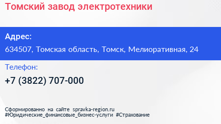 Томский завод электротехники по адресу 634507, Томская область, Томск, Мелиоративная, 24 в дальнейшем Организация, размещена в следующих категориях: