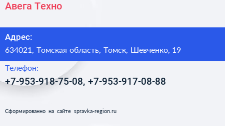 Авега-Техно по адресу 634021, Томская область, Томск, Шевченко, 19 в дальнейшем Организация, размещена в следующих категориях: