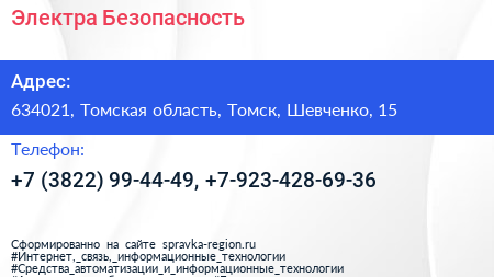 Электра-Безопасность по адресу 634021, Томская область, Томск, Шевченко, 15 в дальнейшем Организация, размещена в следующих категориях: