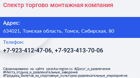 Спектр, торгово-монтажная компания по адресу 634021, Томская область, Томск, Сибирская, 80 в дальнейшем Организация, размещена в следующих категориях: