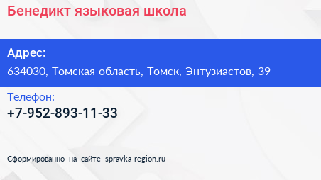 Бенедикт, языковая школа по адресу 634030, Томская область, Томск, Энтузиастов, 39 в дальнейшем Организация, размещена в следующих категориях: