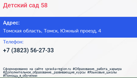 Детский сад №58 по адресу Томская область, Томск, Южный проезд, 4 в дальнейшем Организация, размещена в следующих категориях: