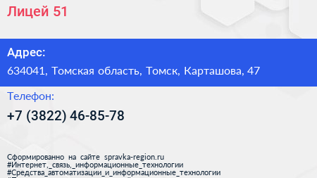 Лицей № 51 по адресу 634041, Томская область, Томск, Карташова, 47 в дальнейшем Организация, размещена в следующих категориях: