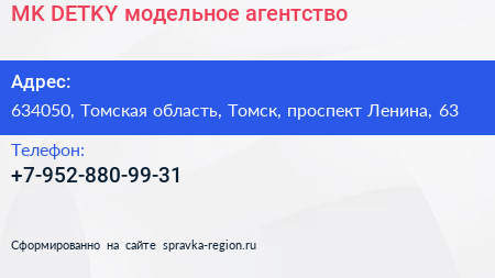 MK DETKY, модельное агентство по адресу 634050, Томская область, Томск, проспект Ленина, 63 в дальнейшем Организация, размещена в следующих категориях: