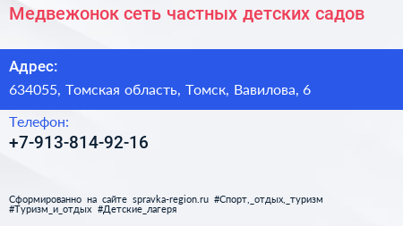 Медвежонок, сеть частных детских садов по адресу 634055, Томская область, Томск, Вавилова, 6 в дальнейшем Организация, размещена в следующих категориях: