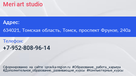 Meri art studio по адресу 634021, Томская область, Томск, проспект Фрунзе, 240а в дальнейшем Организация, размещена в следующих категориях: