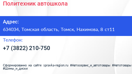 Политехник, автошкола по адресу 634034, Томская область, Томск, Нахимова, 8 ст11 в дальнейшем Организация, размещена в следующих категориях: