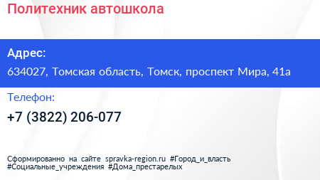 Политехник, автошкола по адресу 634027, Томская область, Томск, проспект Мира, 41а в дальнейшем Организация, размещена в следующих категориях: