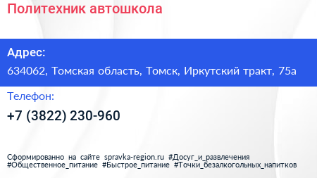 Политехник, автошкола по адресу 634062, Томская область, Томск, Иркутский тракт, 75а в дальнейшем Организация, размещена в следующих категориях: