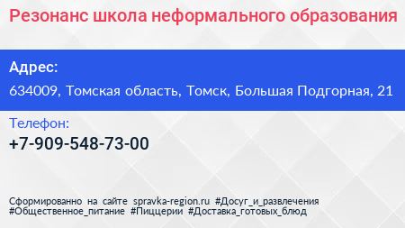 Резонанс, школа неформального образования по адресу 634009, Томская область, Томск, Большая Подгорная, 21 в дальнейшем Организация, размещена в следующих категориях: