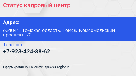 Статус, кадровый центр по адресу 634041, Томская область, Томск, Комсомольский проспект, 70 в дальнейшем Организация, размещена в следующих категориях: