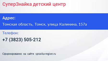 СуперЗнайка, детский центр по адресу Томская область, Томск, улица Калинина, 157а в дальнейшем Организация, размещена в следующих категориях: