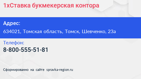 1хСтавка, букмекерская контора по адресу 634021, Томская область, Томск, Шевченко, 23а в дальнейшем Организация, размещена в следующих категориях: