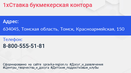 1хСтавка, букмекерская контора по адресу 634045, Томская область, Томск, Красноармейская, 150 в дальнейшем Организация, размещена в следующих категориях: