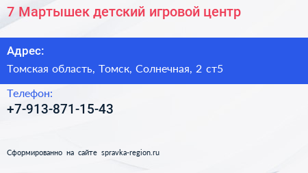 7 Мартышек, детский игровой центр по адресу Томская область, Томск, Солнечная, 2 ст5 в дальнейшем Организация, размещена в следующих категориях: