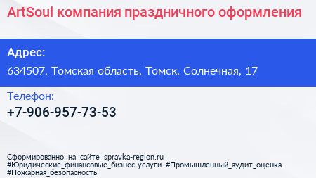 ArtSoul, компания праздничного оформления по адресу 634507, Томская область, Томск, Солнечная, 17 в дальнейшем Организация, размещена в следующих категориях: