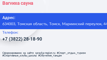 Barvиха, сауна по адресу 634003, Томская область, Томск, Мариинский переулок, 44 в дальнейшем Организация, размещена в следующих категориях: