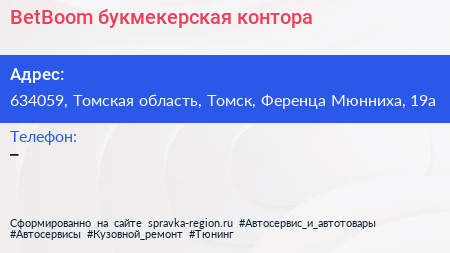 BetBoom, букмекерская контора по адресу 634059, Томская область, Томск, Ференца Мюнниха, 19а в дальнейшем Организация, размещена в следующих категориях: