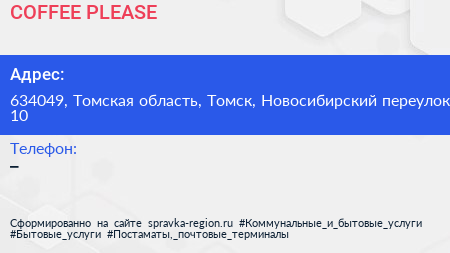 COFFEE, PLEASE! по адресу 634049, Томская область, Томск, Новосибирский переулок, 10 в дальнейшем Организация, размещена в следующих категориях:
