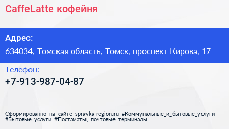 CaffeLatte, кофейня по адресу 634034, Томская область, Томск, проспект Кирова, 17 в дальнейшем Организация, размещена в следующих категориях: