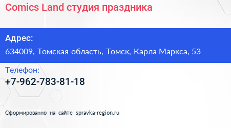 Comics Land, студия праздника по адресу 634009, Томская область, Томск, Карла Маркса, 53 в дальнейшем Организация, размещена в следующих категориях:
