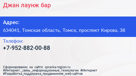 Джан, лаунж-бар по адресу 634041, Томская область, Томск, проспект Кирова, 38 в дальнейшем Организация, размещена в следующих категориях: