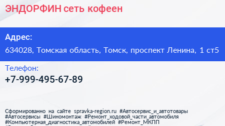 ЭНДОРФИН, сеть кофеен по адресу 634028, Томская область, Томск, проспект Ленина, 1 ст5 в дальнейшем Организация, размещена в следующих категориях: