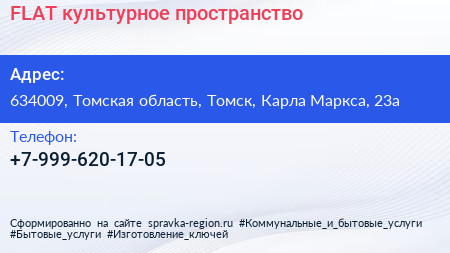 FLAT, культурное пространство по адресу 634009, Томская область, Томск, Карла Маркса, 23а в дальнейшем Организация, размещена в следующих категориях: